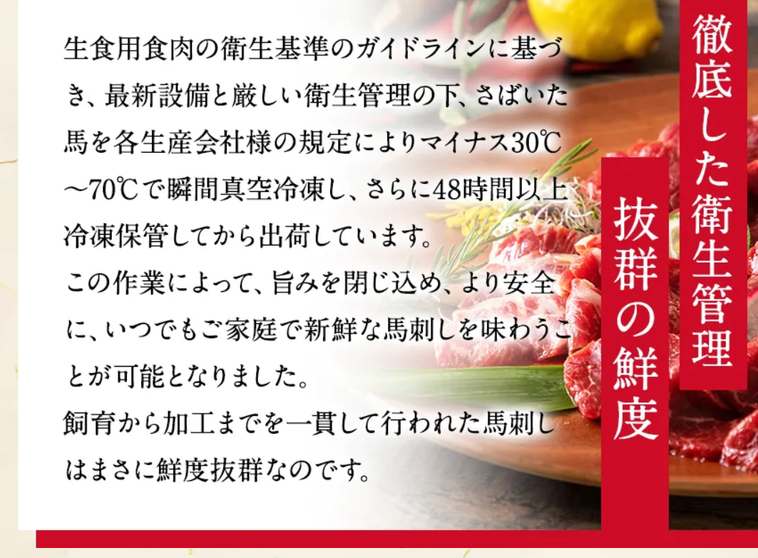これらの工程により、食卓でも安心して生の馬刺しを楽しむことができます。お子様や高齢の方と一緒に食べても安心できる品質です。