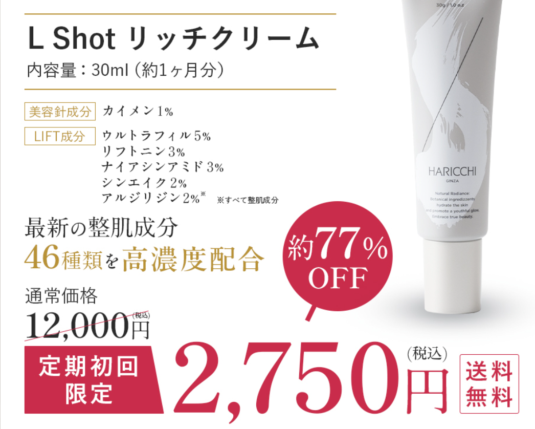 「L shot(エルショット)」は、ほうれい線を本格的にケアしたい方にぴったりの“塗る美顔鍼”クリームです。針状成分による刺激と美容成分の浸透を同時に叶え、ふっくらと若々しい印象へ導いてくれます。