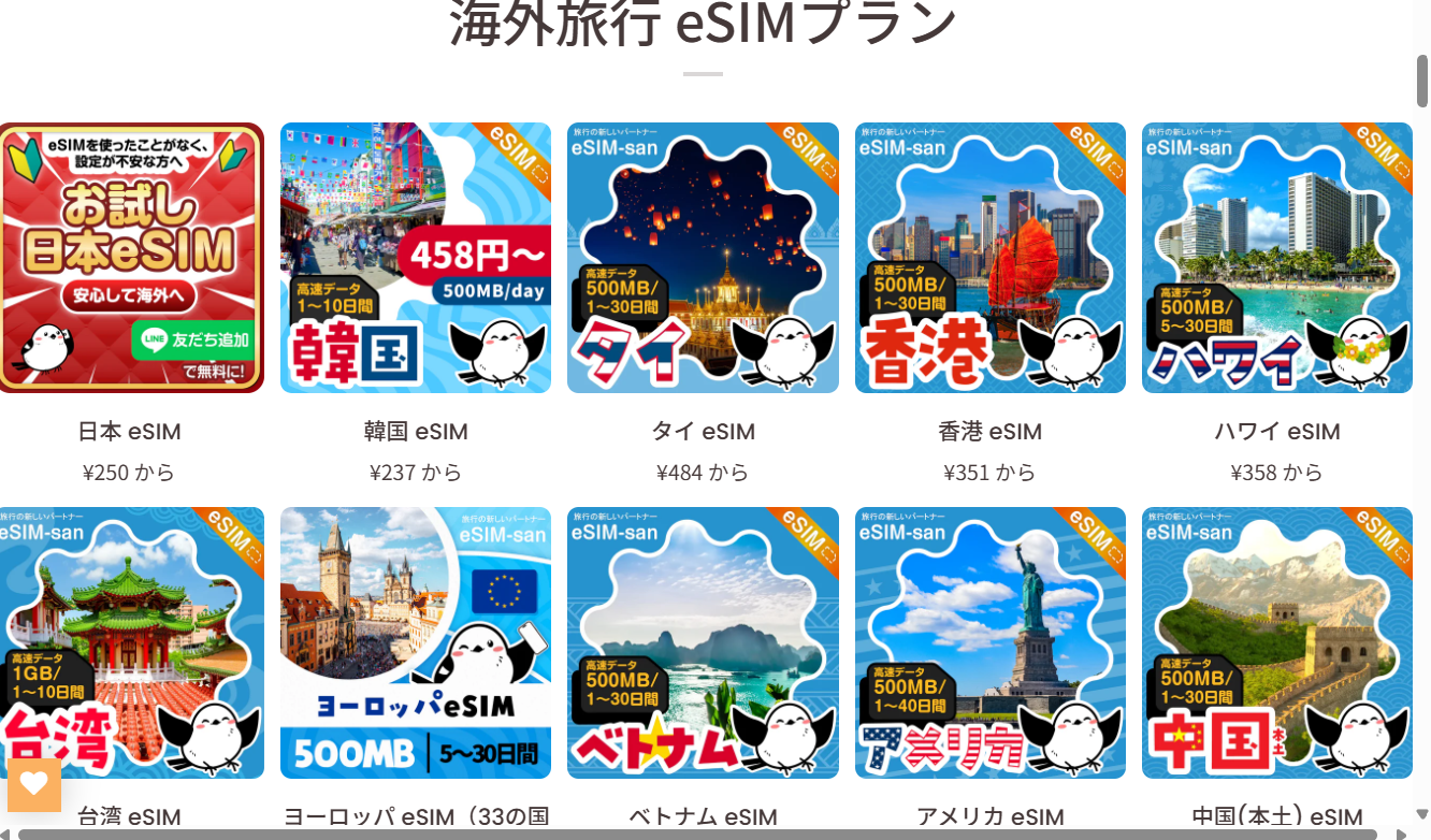 eSIM-san(イーシムさん)は、海外旅行者向けに提供されているeSIMサービスです。複数の国や地域に対応した通信プランが用意されており、短期旅行から長期滞在まで、利用スタイルに合わせて柔軟に選べます。