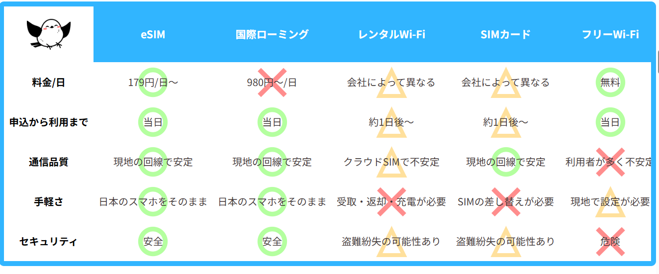 | 比較項目 | eSIM-san | Wi-Fiレンタル | 物理SIM |