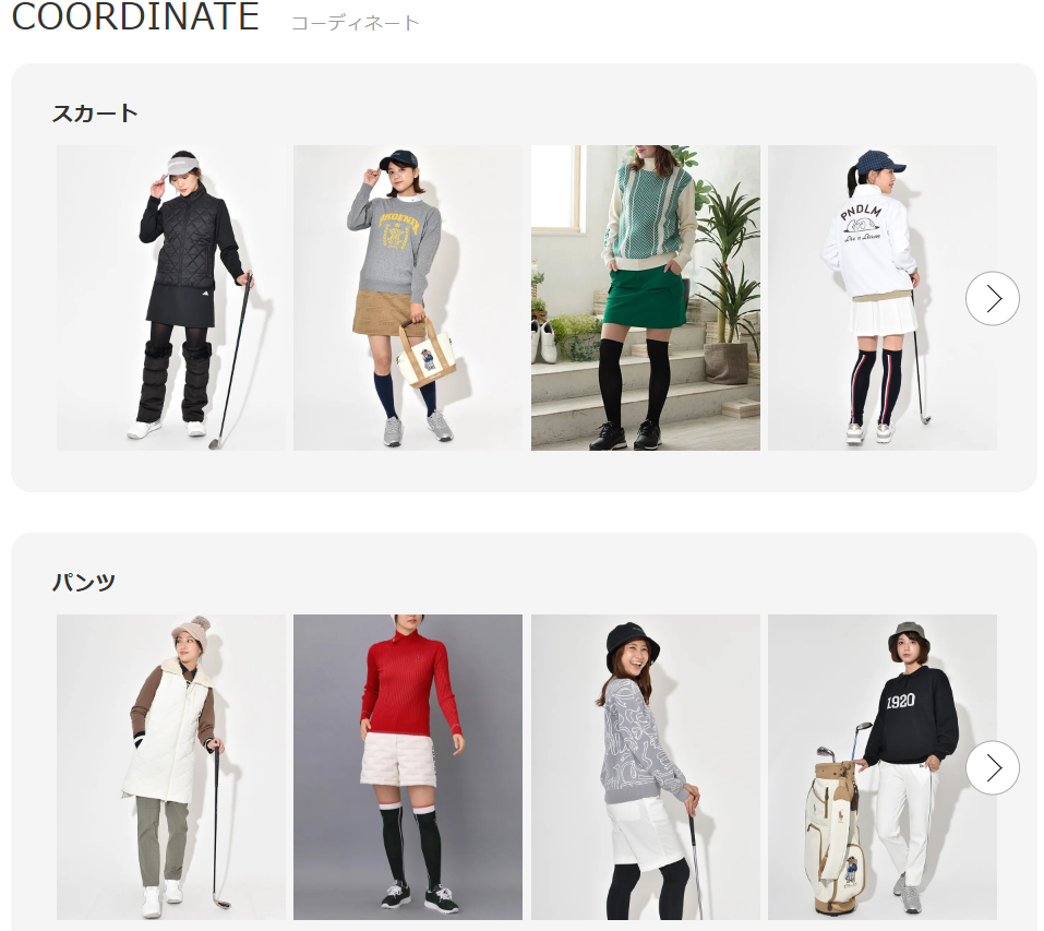 「単品で見ると可愛いけれど、何を合わせればいいか分からない」という悩みに対し、ビビゴルフではプロのスタイリストやショップスタッフによるコーディネート画像を豊富に掲載しています。トップス、ボトムス、サンバイザー、ソックスに至るまで、色の組み合わせやシルエットのバランスが計算されており、そのままセット買い(マネキン買い)することも可能です。これは、ファッションに自信がない方や、忙しくて選ぶ時間がない方にとって非常に心強い味方となります。