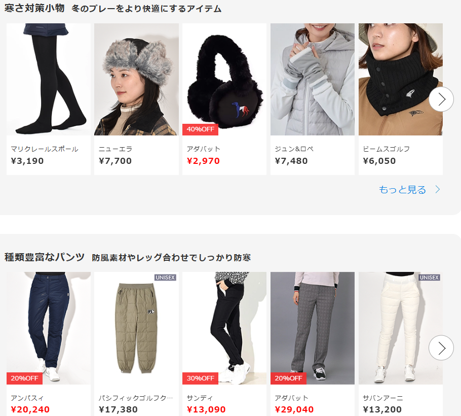 キャップ、バイザー、グローブ、ソックスだけでなく、カートバッグやポーチ、さらには距離計測器ケースまで、オシャレな小物が一堂に会しています。ウェアはシンプルにまとめ、小物に華やかなブランドロゴや柄を取り入れることで、上品な大人のゴルフスタイルが完成します。また、UV対策のレッグカバーやフェイスカバーも充実しており、日焼けを気にする女性への配慮が行き届いています。