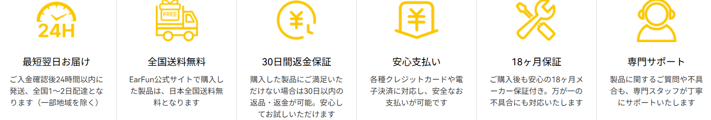 A2:はい、EarFunの多くのモデルは「モノラルモード」に対応しており、左右どちらか片方だけでも音楽再生や通話が可能です。Q3:保証期間はどのくらいありますか?