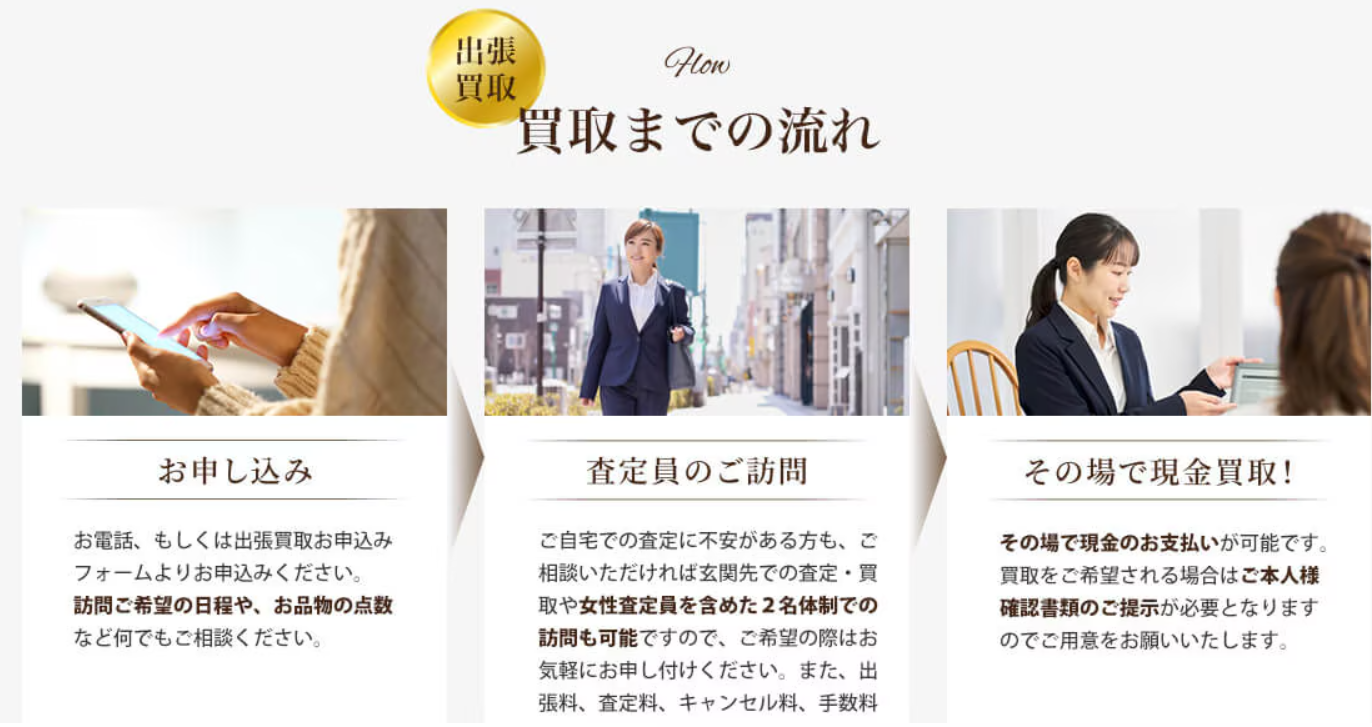 申し込みはオンラインまたは電話で行い、希望日時を指定します。訪問当日は、売却予定の品物をまとめて用意するだけで問題ありません。スタッフが一点ずつ確認し、査定結果を説明します。内容に納得すれば契約が成立し、後日指定口座へ入金されます。