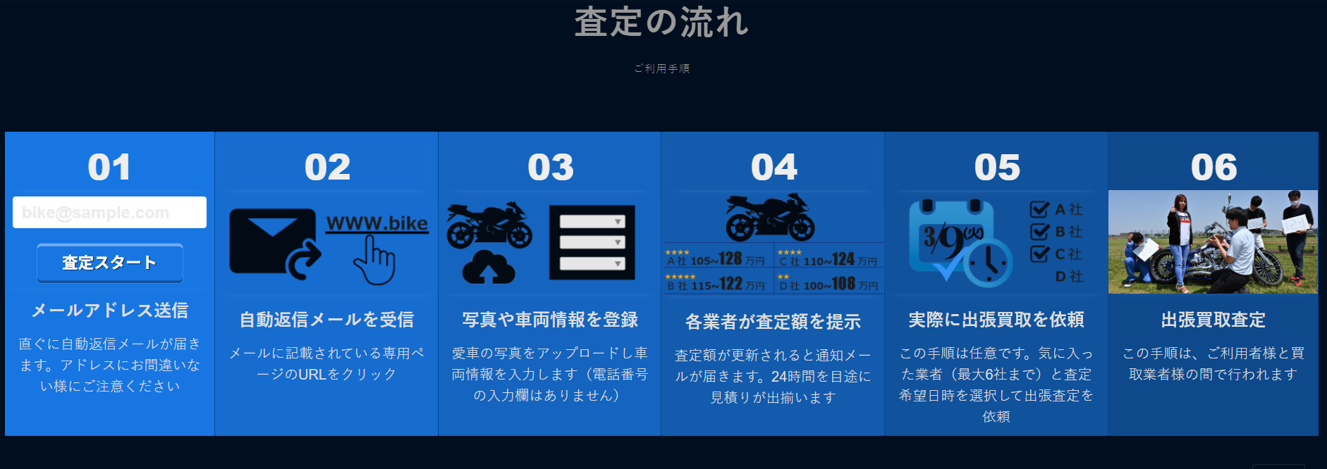 バイク買取【マッスル】の大きな特徴のひとつが、申し込みから査定までの流れがシンプルで分かりやすい点です。ウェブ上の申し込みフォームから基本情報を入力するだけで査定依頼が完了し、その後は専門スタッフが丁寧に対応します。複雑な手続きを避けたい方にとって、安心して利用できる仕組みといえるでしょう。
