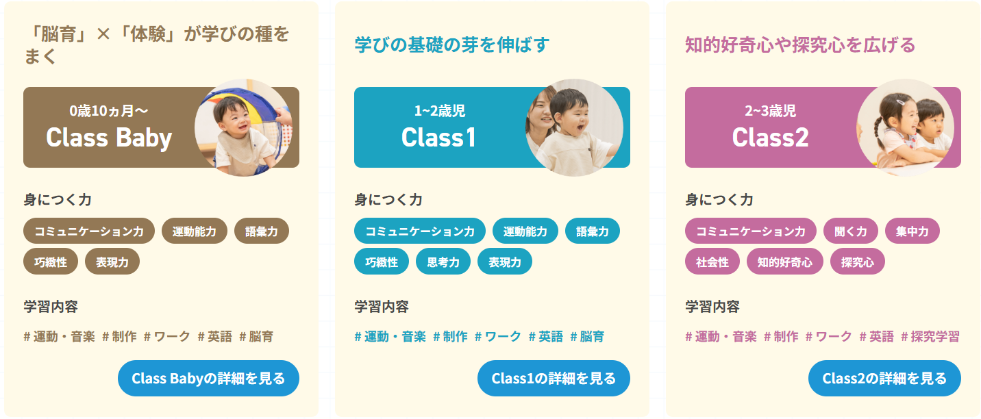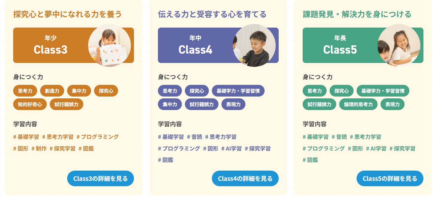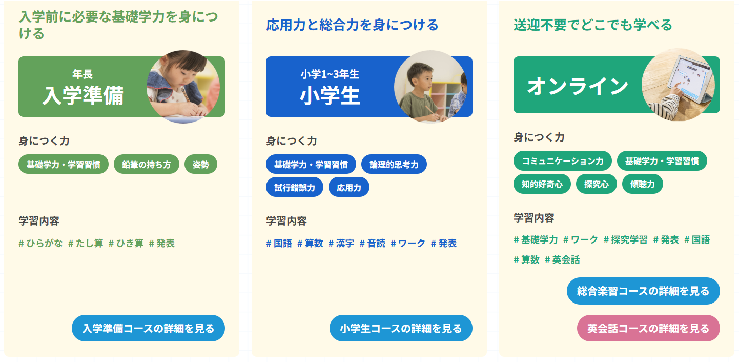 | 教材 | 年齢別専用教材 | 教室ごとに異なる |
