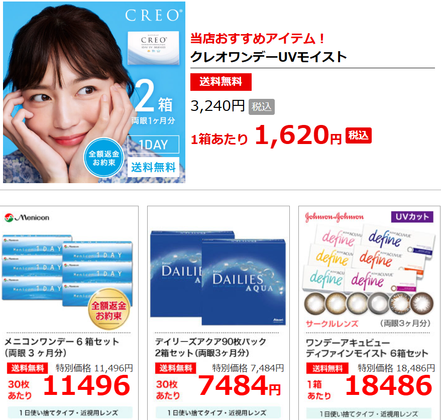 レンズクイックは、国内正規品のコンタクトレンズを幅広く取り扱うオンラインショップです。ワンデー、2ウィーク、乱視用、遠近両用、さらにはカラーコンタクトレンズまで、主要メーカーの製品を網羅しています。