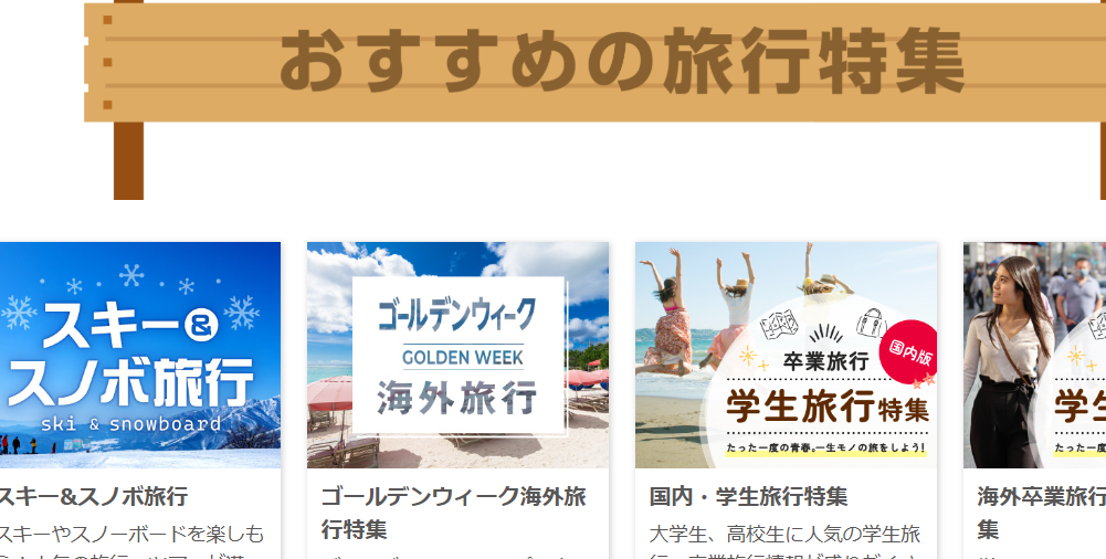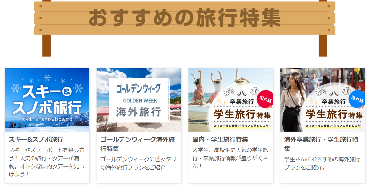 北海道、東北、関東、関西、九州など全国各地のプランが揃っています。温泉旅行、テーマパーク旅行、歴史探訪、グルメ旅など、目的別に選べる点も特徴です。