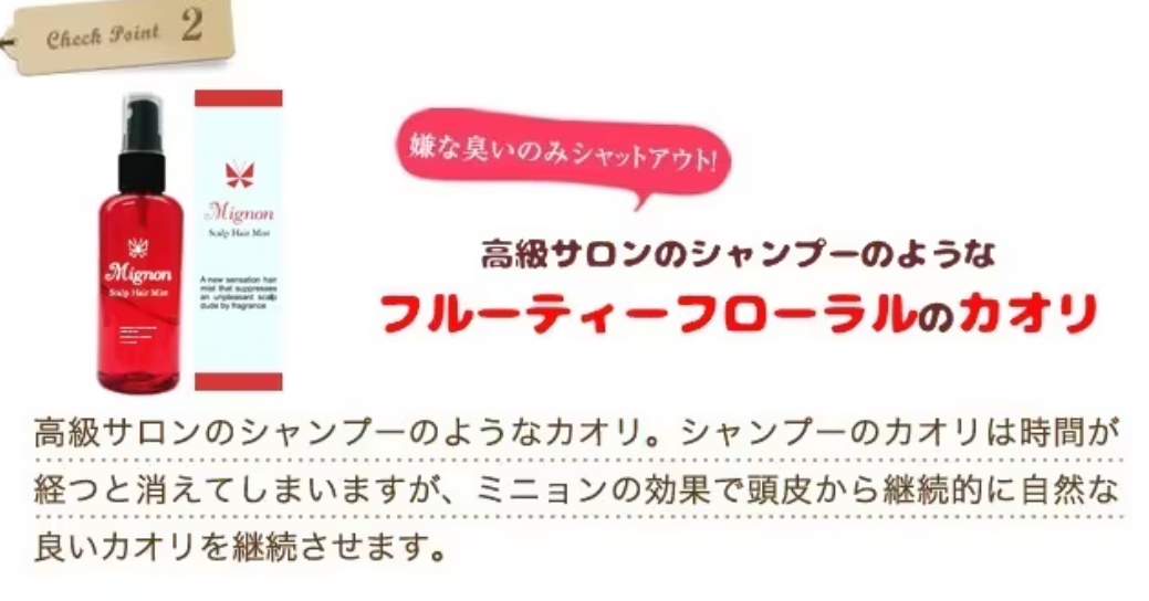 Mignon(ミニョン)は、単なる香水とは異なります。頭皮の環境を整える「スキンケア発想」と、不快なニオイを抑える「芳香効果」を組み合わせたハイブリッドなヘアケアアイテムです。