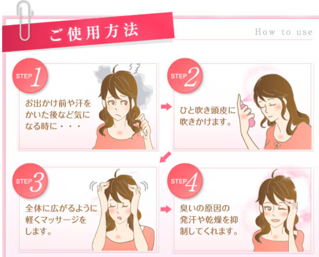 ブラッシングの後、頭皮から少し離してスプレーしてください。朝に使用することで、日中の皮脂の酸化を穏やかに抑え、爽やかな状態を長く保つことができます。