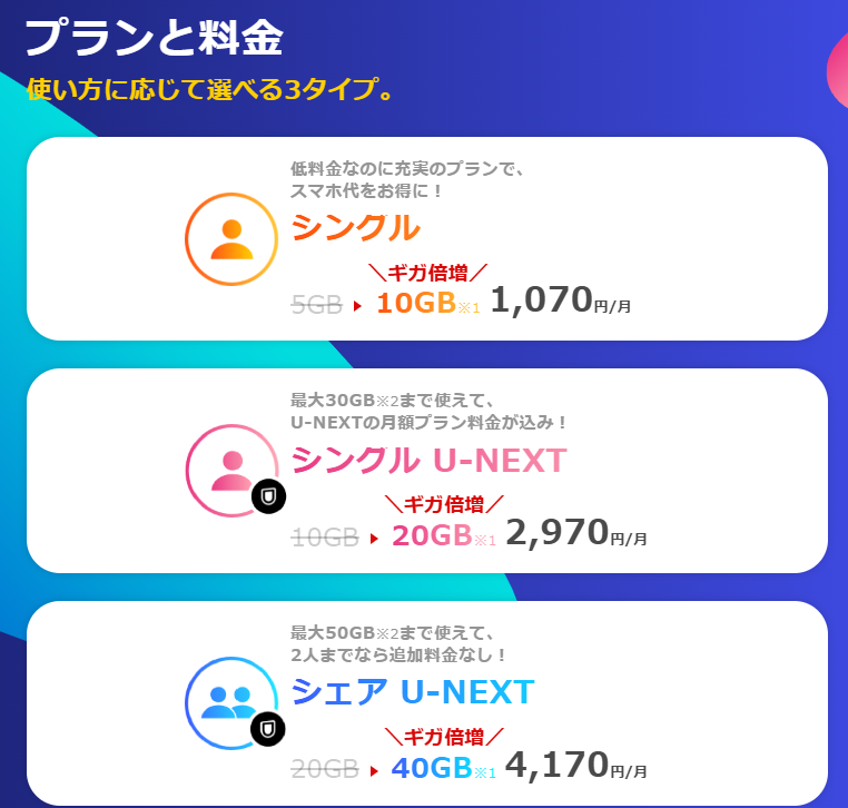 5GBプランや、U-NEXTの月額料金込みプランなど、利用目的に応じて選択できるプランが用意されています。必要以上に複雑なオプションがないため、料金体系がわかりやすい点も特長です。