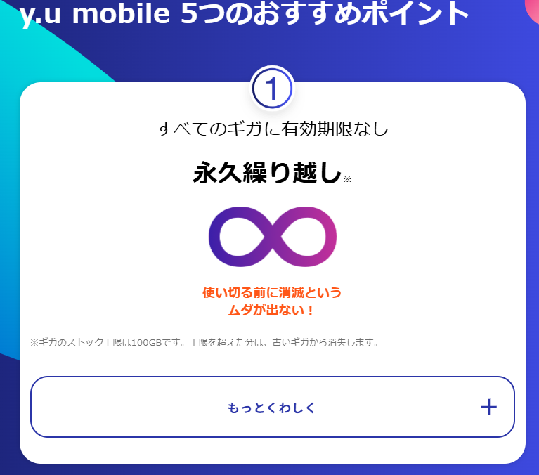 特に注目されているのが「ギガの永久繰り越し」という仕組みです。一般的な格安SIMでは、当月使い切れなかったデータ容量は翌月までしか繰り越せないケースが多いですが、y.u mobileでは一定上限内で無期限にストックが可能です。そのため、データ通信量に波がある方でも効率よく利用できます。