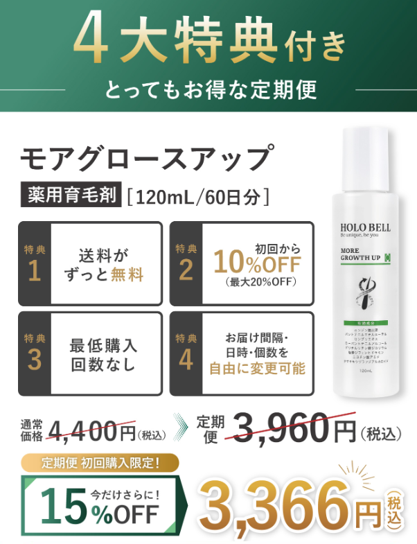 薄毛や抜け毛の対策は、正しい知識と信頼できるアイテム選びから始まります。モアグロースアップは、最新のナノ技術によって「成分を届ける力」を高め、さらに業界最多クラスの8種の有効成分によって「育む力」を最大化させた、まさに育毛ケアの集大成です。