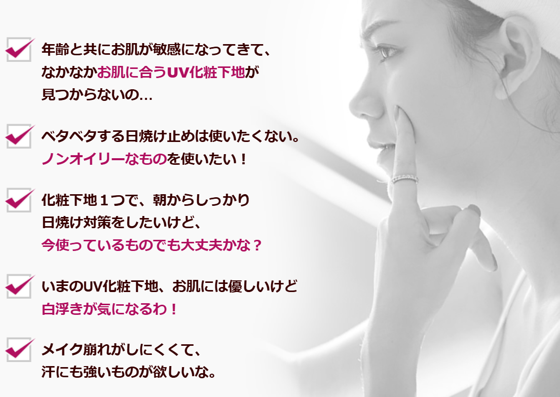 - A2. 紫外線吸収剤不使用のノンケミカル処方ですので、多くの方に毎日お使いいただけます。ご心配な場合はパッチテストをおすすめします。