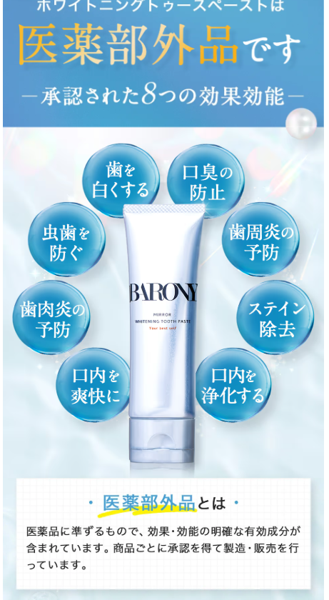 BARONYミラーホワイトニングは、歯の汚れを落としながら、歯本来の色味を引き出すことを目指した歯磨きジェルです。