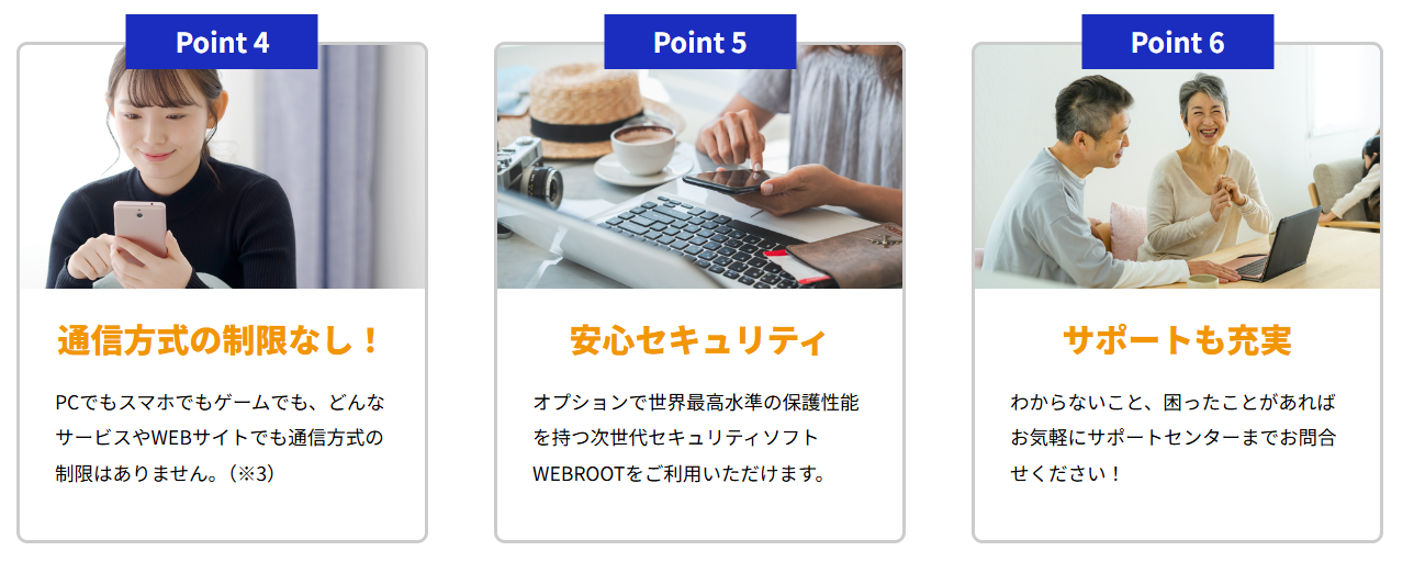 インターネットの契約で多くの人が感じる「複雑さ」を排除しました。追加オプションの強制加入や、数ヶ月後から急激に料金が上がるような不透明な仕組みはありません。長く安心して使っていただくために、シンプルで納得感のあるプランニングを徹底しています。