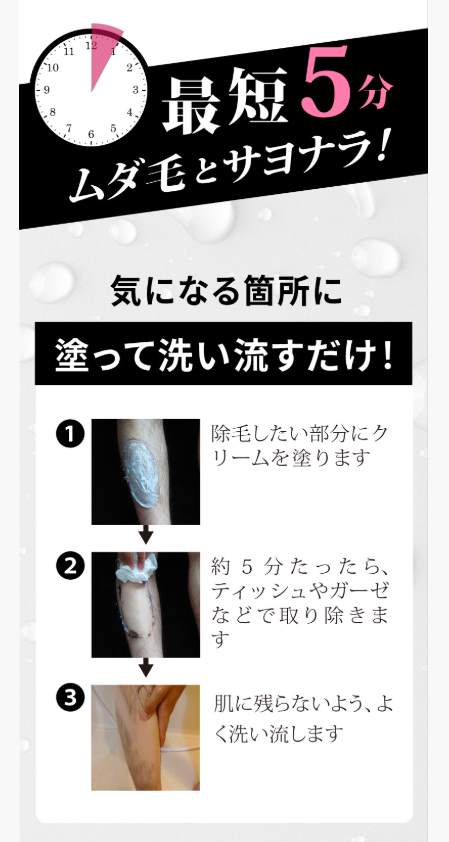 最大の特徴は、除毛後の肌を整えるための保湿成分が贅沢に配合されている点です。除毛クリーム特有のツンとした刺激臭を抑え、バスタイムをリラックスした時間に変える工夫が施されています。