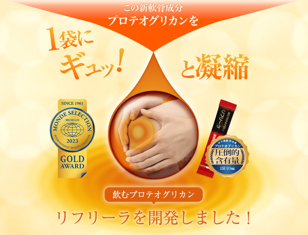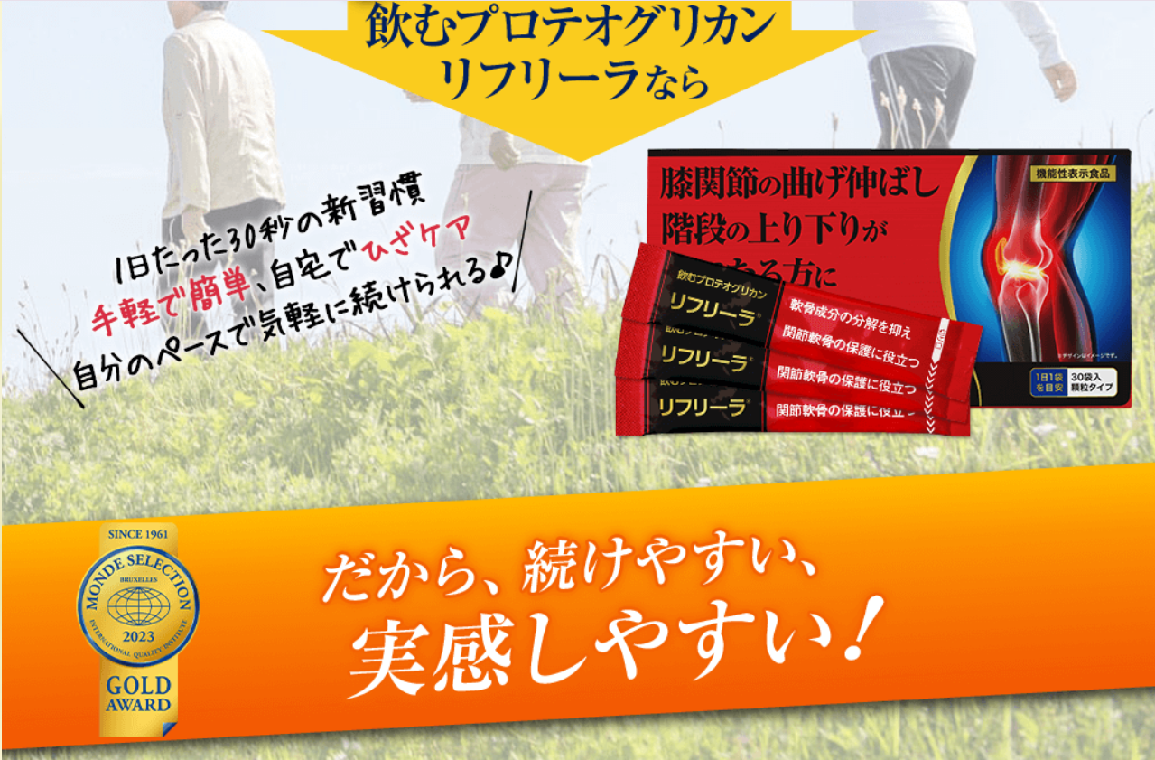 そんな中、ひざ関節の可動性をサポートする成分として注目されているのが「プロテオグリカン」です。今回は、機能性表示食品として展開されている「飲むプロテオグリカン リフリーラ」について、その特徴やメリット、選ばれる理由を詳しく解説します。