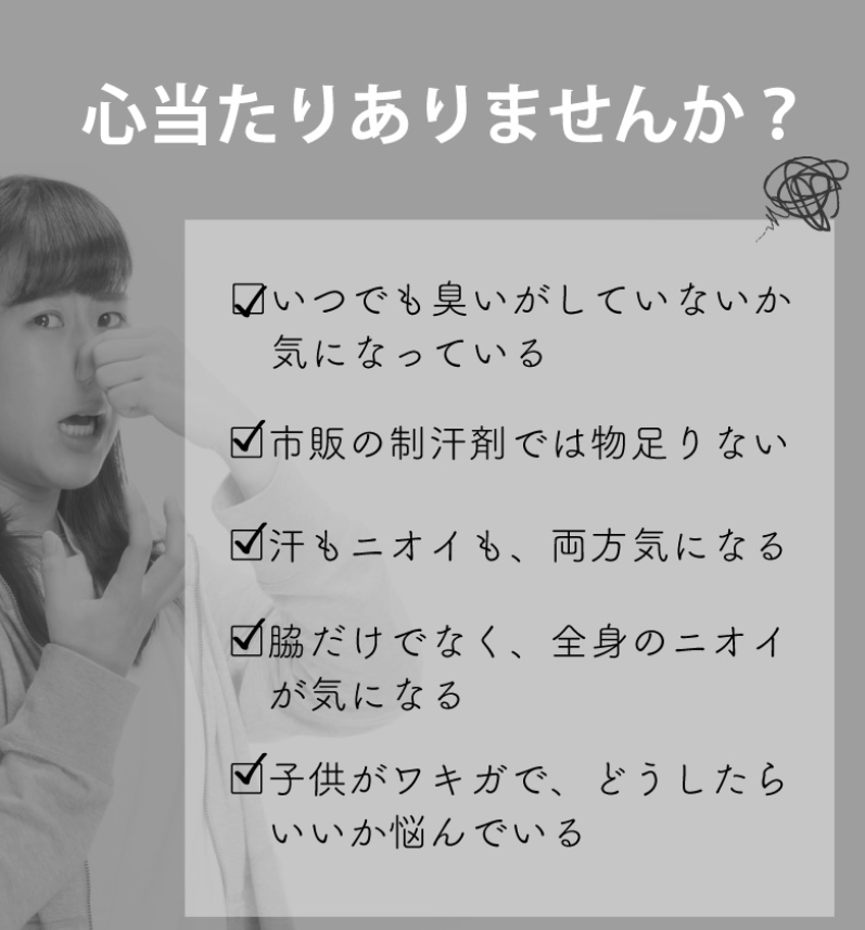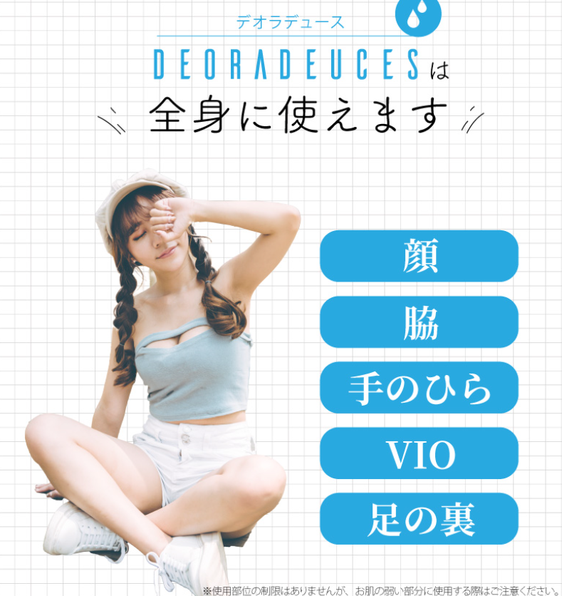 A3. 脇、足、首筋、背中など、ニオイが気になる部位にご使用いただけます。ただし、粘膜や傷口、除毛直後のデリケートな肌への使用はお控えください。