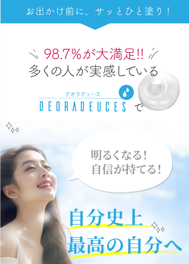 自分自身をケアすることは、周囲への配慮であると同時に、自分自身の心に余裕を持つための大切なステップです。DEORADEUCES(デオラデュース)は、確かな密着力と肌への優しさを両立させた、現代人のためのニオイ対策クリームです。成分にこだわり、使い心地を追求したこの一品を、あなたの日常に取り入れてみてはいかがでしょうか。