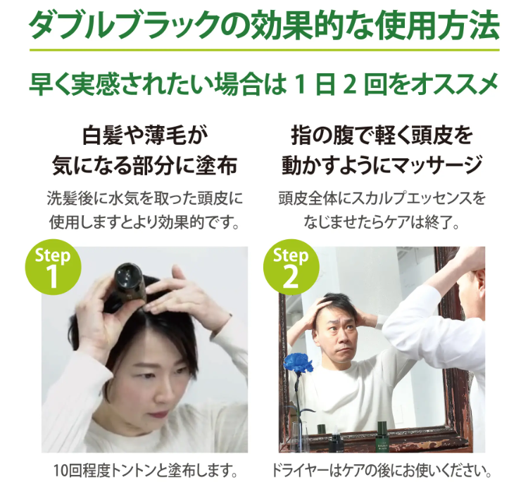 清潔な頭皮に適量を塗布し、やさしくなじませてください。毎日の習慣として取り入れることで、継続的なケアが可能です。